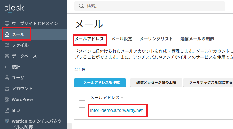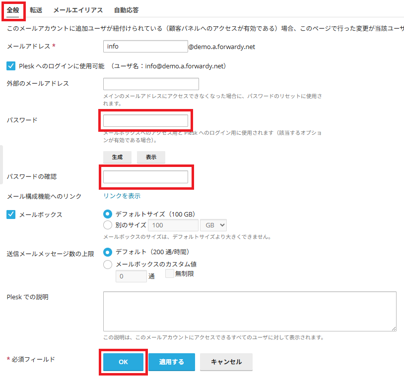 本マニュアルでは メールアドレスのパスワード変更の操作方法をご案内します。 1.Plesk コントロールパネルにログインして確認します。 ログイン方法はこちらをご確認ください。 2.メニュー「メール」→「メールアドレス」→パスワードを変更したいメールアドレスをクリック 3.「全般」画面の「パスワード」と「パスワードの確認」の項目に設定するパスワードを入力し、「OK」をクリック 「表示」ボタンを押すと、入力した文字列を確認することができます。